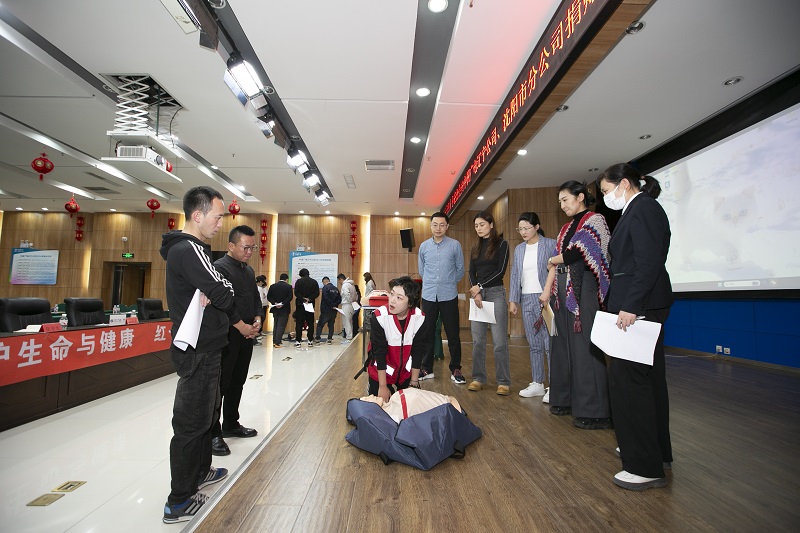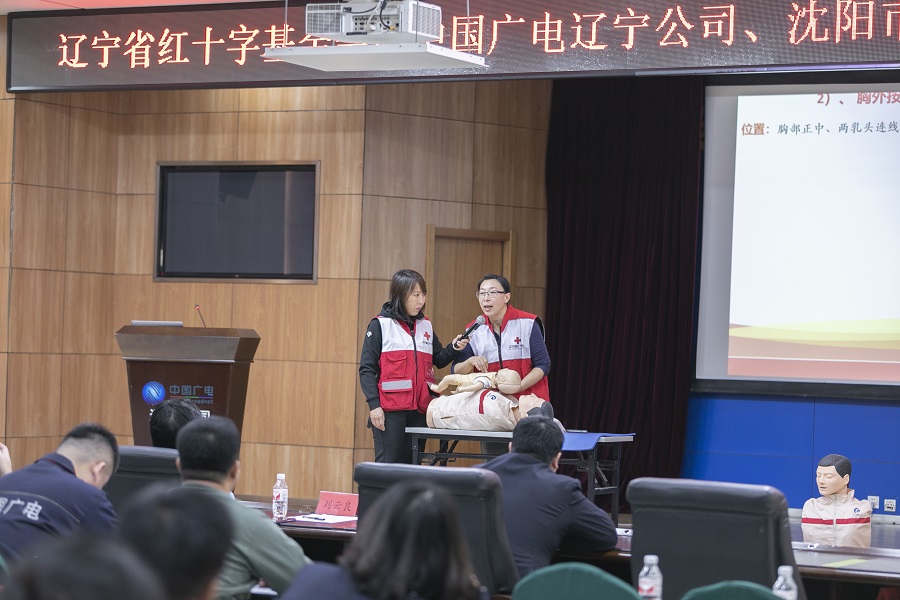 遼寧省紅十字應急救護志愿服務隊趙俊秀現場為學員演示?心肺復蘇(?CPR)步驟?