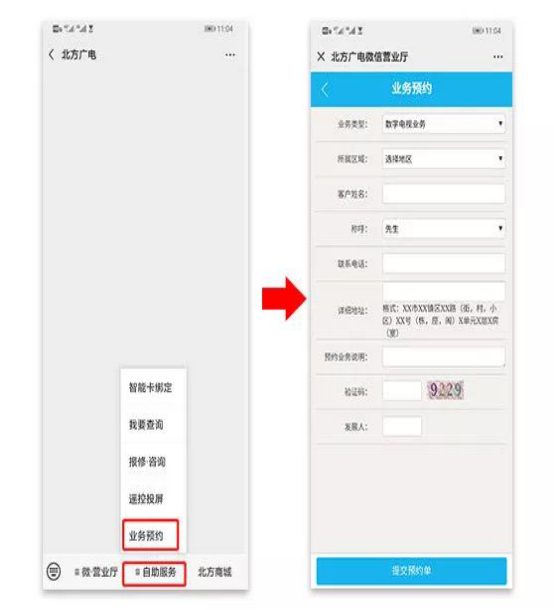 關注(zhu)北方廣電微(wei)信服務(wu)號,選擇菜單(dan)下(xia)方“自(zi)助服(fu)務(wu)—業(ye)務(wu)預約(yue)”,即可預約(yue)您想辦理(li)的業(ye)務(wu)。