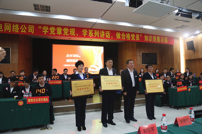 決賽(sai)中,各黨支部代表隊精(jing)(jing)力集(ji)中、反應(ying)敏捷,競賽(sai)氣(qi)氛緊張(zhang)激(ji)烈、精(jing)(jing)彩迭出(chu)、扣人心弦(xian),參賽(sai)黨員(yuan)們出(chu)色的(de)表現贏得了在(zai)場(chang)觀眾的(de)陣陣掌(zhang)聲。在(zai)個(ge)人必答(da)(da)和共答(da)(da)環(huan)節各隊不分伯仲;搶答(da)(da)環(huan)節你追我趕,差距漸生(sheng);在(zai)最后的(de)風(feng)險答(da)(da)題環(huan)節中,選(xuan)手們更是沉(chen)穩應(ying)對,膽大心細,斗(dou)智斗(dou)勇。經過一個(ge)多(duo)小時的(de)激(ji)烈角逐,營口分公司代表隊冠壓(ya)群雄,以280分(fen)(fen)(fen)(fen)(fen)獲(huo)(huo)得(de)(de)第(di)一(yi)名;錦州分(fen)(fen)(fen)(fen)(fen)公(gong)(gong)(gong)司(si)(si)(si)和(he)丹東分(fen)(fen)(fen)(fen)(fen)公(gong)(gong)(gong)司(si)(si)(si)代(dai)表隊緊隨其(qi)后,獲(huo)(huo)得(de)(de)二等獎(jiang);鐵嶺分(fen)(fen)(fen)(fen)(fen)公(gong)(gong)(gong)司(si)(si)(si)、遼陽分(fen)(fen)(fen)(fen)(fen)公(gong)(gong)(gong)司(si)(si)(si)和(he)葫蘆(lu)島分(fen)(fen)(fen)(fen)(fen)公(gong)(gong)(gong)司(si)(si)(si)獲(huo)(huo)得(de)(de)三(san)等獎(jiang);盤錦分(fen)(fen)(fen)(fen)(fen)公(gong)(gong)(gong)司(si)(si)(si)、阜(fu)新分(fen)(fen)(fen)(fen)(fen)公(gong)(gong)(gong)司(si)(si)(si)、鞍山分(fen)(fen)(fen)(fen)(fen)公(gong)(gong)(gong)司(si)(si)(si)、沈陽分(fen)(fen)(fen)(fen)(fen)公(gong)(gong)(gong)司(si)(si)(si)、撫順分(fen)(fen)(fen)(fen)(fen)公(gong)(gong)(gong)司(si)(si)(si)和(he)朝陽分(fen)(fen)(fen)(fen)(fen)公(gong)(gong)(gong)司(si)(si)(si)獲(huo)(huo)得(de)(de)優秀獎(jiang)。鐵嶺分(fen)(fen)(fen)(fen)(fen)公(gong)(gong)(gong)司(si)(si)(si)、營(ying)口(kou)分(fen)(fen)(fen)(fen)(fen)公(gong)(gong)(gong)司(si)(si)(si)和(he)錦州分(fen)(fen)(fen)(fen)(fen)公(gong)(gong)(gong)司(si)(si)(si)黨委,因“兩學一(yi)做”知識競賽活動(dong)組(zu)織有力而榮獲(huo)(huo)優秀組(zu)織獎(jiang),其(qi)他分(fen)(fen)(fen)(fen)(fen)公(gong)(gong)(gong)司(si)(si)(si)黨委(總支)榮獲(huo)(huo)組(zu)織獎(jiang)。