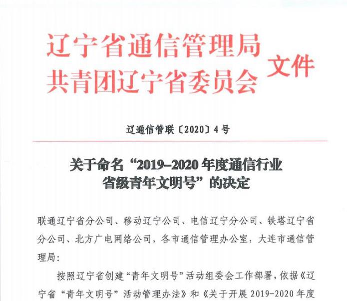 2020年(nian)(nian)7月初,遼(liao)寧(ning)省(sheng)“青(qing)年(nian)(nian)文(wen)明(ming)號”活(huo)動組(zu)(zu)委會(hui)啟動了創建活(huo)動。5個月的時間(jian),全省(sheng)多家通信行業(ye)企業(ye)精心組(zu)(zu)織實施、積(ji)極(ji)參評(ping)活(huo)動。最終經過活(huo)動組(zu)(zu)委會(hui)審核評(ping)選,遼(liao)寧(ning)省(sheng)通信管理局和共青(qing)團遼(liao)寧(ning)省(sheng)委員會(hui)決定命(ming)名北(bei)方廣(guang)電網(wang)絡公(gong)司(si)(si)(si)信息科技服務分公(gong)司(si)(si)(si)呼(hu)叫運營中心、北(bei)方廣(guang)電網(wang)絡公(gong)司(si)(si)(si)沈陽分公(gong)司(si)(si)(si)鐵西區域二公(gong)司(si)(si)(si)北(bei)一路營業(ye)廳等10個通信行業(ye)集體為(wei)“2019-2020年(nian)(nian)度通信行業(ye)省(sheng)級青(qing)年(nian)(nian)文(wen)明(ming)號”。