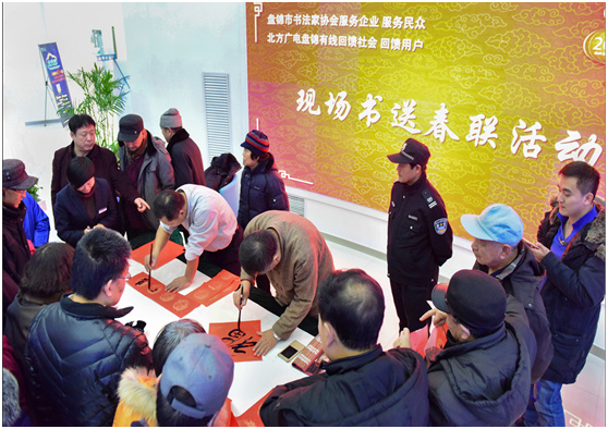 “猴去靈動在,雞來(lai)福氣生”,為貼近客戶(hu),節前(qian)造勢,營造歡樂祥和的新年(nian)、春節假日期間(jian)營銷宣傳氛圍,2016年12月29日,北方廣(guang)電網(wang)絡公司盤錦分公司、盤錦市書法家(jia)協會聯(lian)(lian)合舉辦“書法名家(jia)現(xian)場送春聯(lian)(lian)”活動(dong)。十八位書法家(jia)同時揮(hui)毫潑墨為用戶和市民送上(shang)丁(ding)酉年(nian)的第一份新春祝(zhu)福。