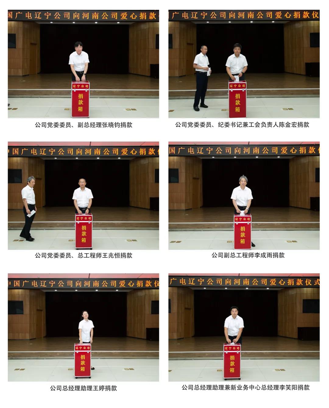 2021年(nian)8月2日,中國廣電(dian)遼(liao)寧網絡股(gu)份(fen)有(you)限公(gong)司(si)(si)(簡稱中國廣電(dian)遼(liao)寧公(gong)司(si)(si))黨委發(fa)出《向中國廣電(dian)河(he)南公(gong)司(si)(si)愛(ai)(ai)心(xin)捐(juan)款(kuan)倡議書》,公(gong)司(si)(si)總部及(ji)各(ge)市分(fen)(子(zi))公(gong)司(si)(si)分(fen)別舉行了“洪水(shui)無情 廣電(dian)有(you)愛(ai)(ai)”捐(juan)款(kuan)儀式。公(gong)司(si)(si)領(ling)(ling)導曾紹武(wu)、張曉鈞、陳金宏、王兆恒、要(yao)春華(hua),總助級(ji)領(ling)(ling)導李(li)成雨、王婷、劉國會、李(li)笑陽(yang)帶頭捐(juan)助,以表(biao)達對(dui)河(he)南公(gong)司(si)(si)同仁和(he)災(zai)區人民(min)的關愛(ai)(ai)之(zhi)情。