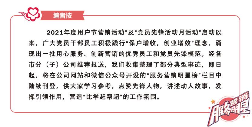 公(gong)司“用戶(hu)(hu)(hu)節(jie)”營銷活(huo)動開(kai)始后,吳興華帶領團(tuan)隊積極向(xiang)老用戶(hu)(hu)(hu)宣傳(chuan)優惠套(tao)餐,向(xiang)離網(wang)用戶(hu)(hu)(hu)宣傳(chuan)回網(wang)政策。他將銷售高清機頂盒(he)、愛奇藝(yi)產品(pin),回收(shou)舊(jiu)機頂盒(he)和銷售非網(wang)產品(pin)列入工作重點,取(qu)得了優異的工作業績。吳興華表示,“用戶(hu)(hu)(hu)節(jie)”惠民政策多,是(shi)“穩固開(kai)拓(tuo)基本戶(hu)(hu)(hu)、大力發展(zhan)寬帶戶(hu)(hu)(hu)、積極拓(tuo)展(zhan)互動戶(hu)(hu)(hu)”的有利時機,一定要和客(ke)服專員們(men)干出成績,取(qu)得效果,把中國廣電的優質服務帶到(dao)千家萬(wan)戶(hu)(hu)(hu)。