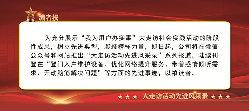 時刻把用戶(hu)事(shi)放在心(xin)坎(kan)上(shang),走深、走實(shi)、走心(xin)“我為用戶(hu)辦(ban)實(shi)事(shi)”大走訪社會實(shi)踐活動,已成為大連(lian)天途公(gong)司干部員工的座右銘。他們(men)用熱情(qing)與微笑表達善意,真誠服務中包(bao)含著(zhu)濃濃的人(ren)情(qing)味(wei)。他們(men)沒有過多的豪言壯語,卻用實(shi)際行動詮釋(shi)了中國廣電遼寧公(gong)司人(ren)的責任與擔當。