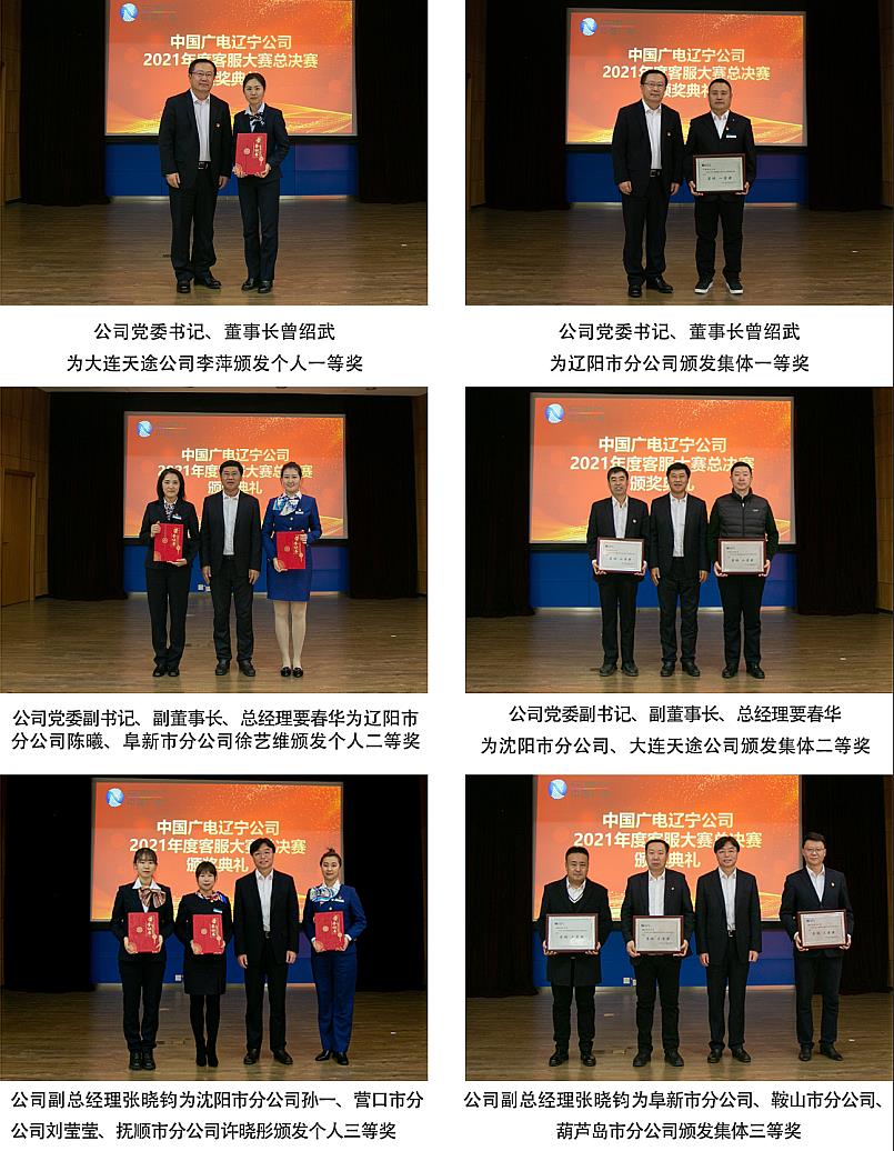 頒(ban)獎(jiang)儀式結束后,公(gong)司(si)黨委書記、董事長曾(ceng)紹(shao)武(wu)發(fa)表了(le)(le)(le)熱情洋溢的講話(hua)。他(ta)首(shou)先(xian)向獲獎(jiang)個人(ren)和(he)(he)集體表示祝賀,向積極(ji)參與大賽(sai)的員工(gong)和(he)(he)各(ge)分(fen)(子)公(gong)司(si)表示感(gan)謝(xie),對賽(sai)事組(zu)委會的精(jing)心組(zu)織表示贊(zan)揚(yang)。他(ta)表示,此次(ci)大賽(sai)在(zai)公(gong)司(si)去年(nian)(nian)首(shou)屆客服(fu)(fu)大賽(sai)的基(ji)礎上(shang),對形式進(jin)(jin)行了(le)(le)(le)創新(xin)、對內容進(jin)(jin)行了(le)(le)(le)豐(feng)(feng)富(fu)、對范(fan)圍進(jin)(jin)行了(le)(le)(le)拓展(zhan)(zhan),取得了(le)(le)(le)良好的成效。在(zai)競賽(sai)過程中(zhong),每名選手都能高度(du)重視、認(ren)真準備,賽(sai)出了(le)(le)(le)能力,賽(sai)出了(le)(le)(le)水平,賽(sai)出了(le)(le)(le)遼(liao)(liao)寧廣(guang)(guang)電人(ren)積極(ji)向上(shang)的精(jing)神風貌(mao),為(wei)大家(jia)點贊(zan)!曾(ceng)紹(shao)武(wu)董事長指出,中(zhong)國廣(guang)(guang)電遼(liao)(liao)寧公(gong)司(si)屬于服(fu)(fu)務(wu)型(xing)企業,服(fu)(fu)務(wu)是企業賴以生存的基(ji)礎,我(wo)們要始終秉持(chi)“服(fu)(fu)務(wu)至(zhi)上(shang)”的理(li)念,努(nu)力提升為(wei)用戶(hu)服(fu)(fu)務(wu)的質(zhi)量。距離2022年(nian)(nian)還(huan)有15天(tian)時間了(le)(le)(le),希望(wang)大家(jia)能夠帶著(zhu)本次(ci)大賽(sai)的豐(feng)(feng)碩成果回(hui)到(dao)工(gong)作(zuo)崗位上(shang),勤勉工(gong)作(zuo),努(nu)力做(zuo)好年(nian)(nian)度(du)沖刺(ci)、年(nian)(nian)終收尾和(he)(he)新(xin)年(nian)(nian)“開門紅”工(gong)作(zuo),共(gong)同(tong)為(wei)公(gong)司(si)轉型(xing)升級高質(zhi)量發(fa)展(zhan)(zhan)做(zuo)貢獻,迎接更加美好的未來!
