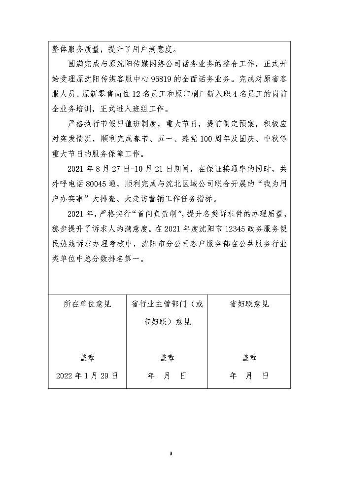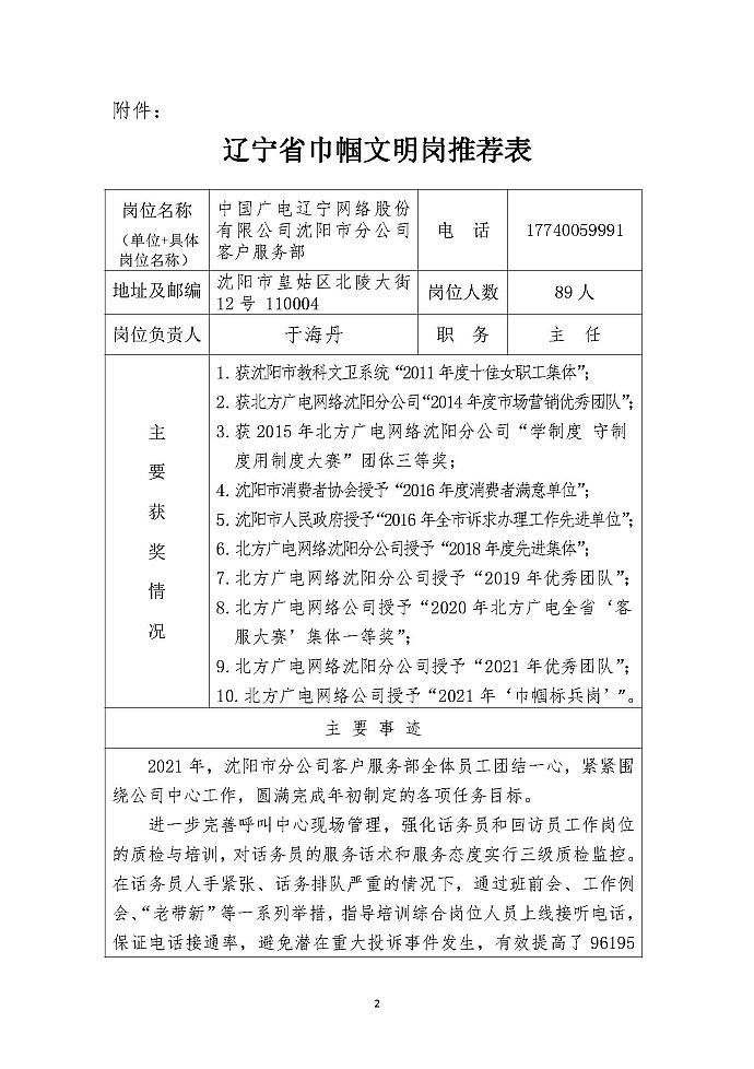 關于擬推薦沈陽市分公司客戶服務部為遼寧省巾幗文明崗表彰對象的公示