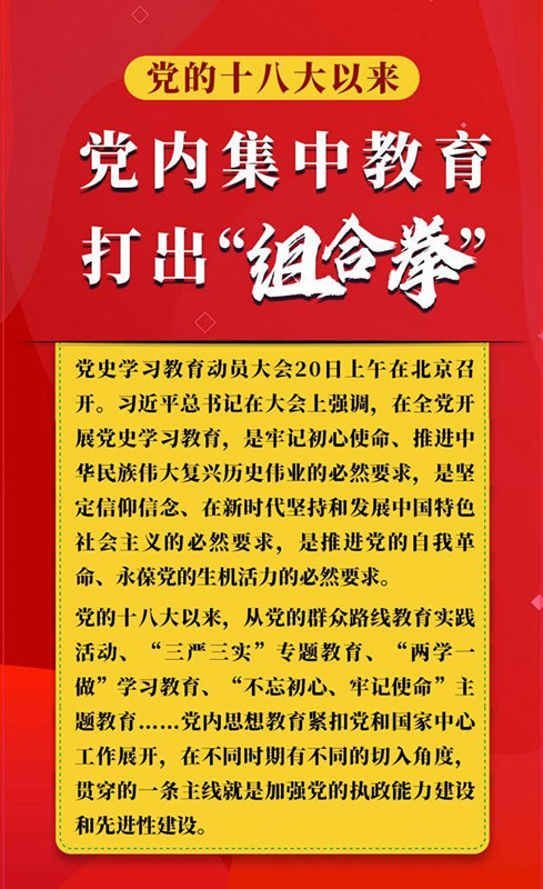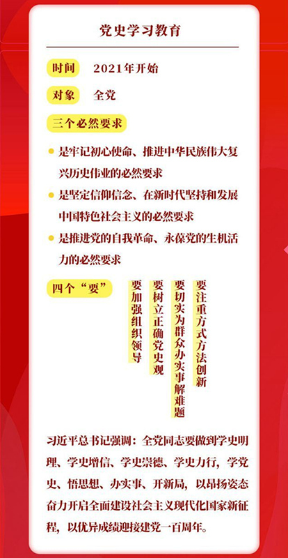 這次黨(dang)史(shi)學習教育,是黨(dang)的十八大以來第5次黨內(nei)集中教(jiao)(jiao)育(yu)(yu)(前4次分別是:黨的(de)群眾(zhong)路(lu)線教(jiao)(jiao)育(yu)(yu)實踐活動(dong)、“三嚴三實”專(zhuan)題(ti)(ti)教(jiao)(jiao)育(yu)(yu)、“兩學(xue)一做”學(xue)習教(jiao)(jiao)育(yu)(yu)、“不忘初心、牢記使(shi)命”主題(ti)(ti)教(jiao)(jiao)育(yu)(yu)),又(you)恰逢(feng)建黨百(bai)年(nian)的(de)重(zhong)大時刻,“兩個一百(bai)年(nian)”歷史交匯的(de)關鍵節點,具有十分深遠的(de)意義。
