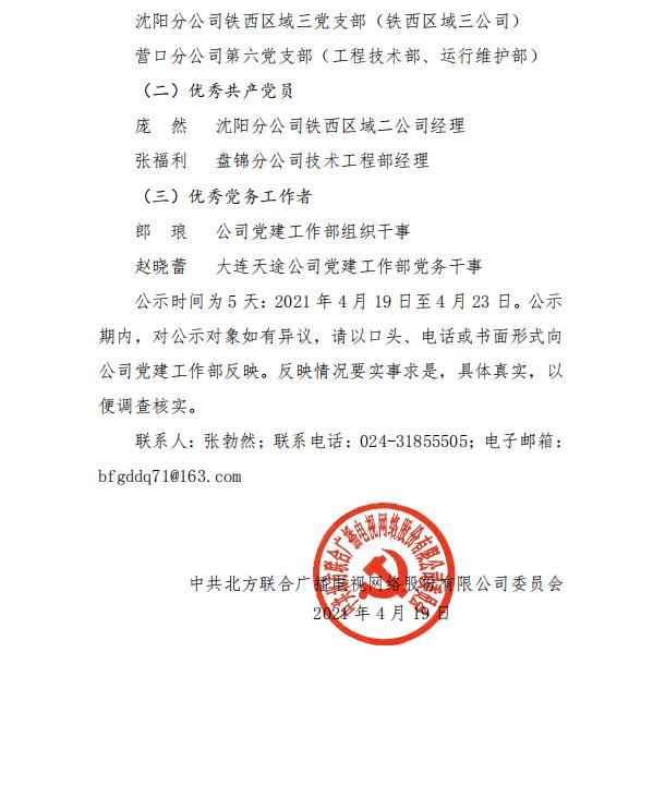 北方廣電網絡公司黨委關于全省和省(中)直企業“兩優一先”推薦對象的公示