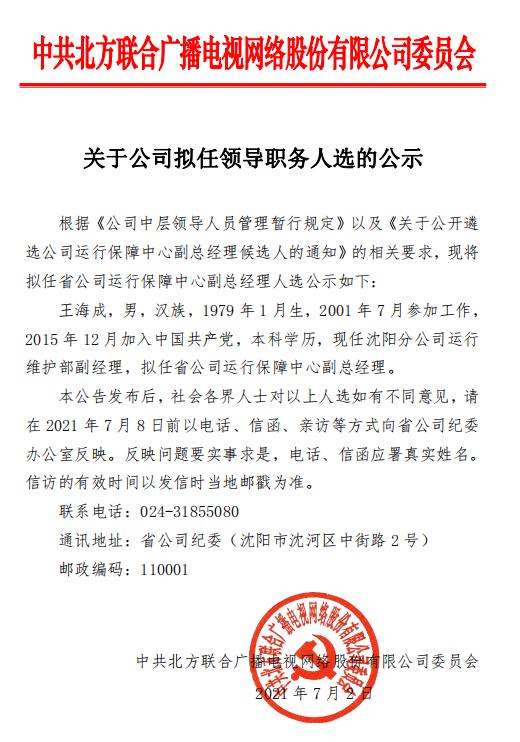 北方廣電網絡公司黨委關于全省和省(中)直企業“兩優一先”推薦對象的公示