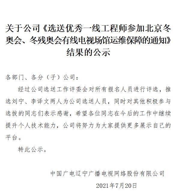 關于公司《選送優秀一線工程師參加北京冬奧會、冬殘奧會有線電視場館運維保障的通知》結果的公示