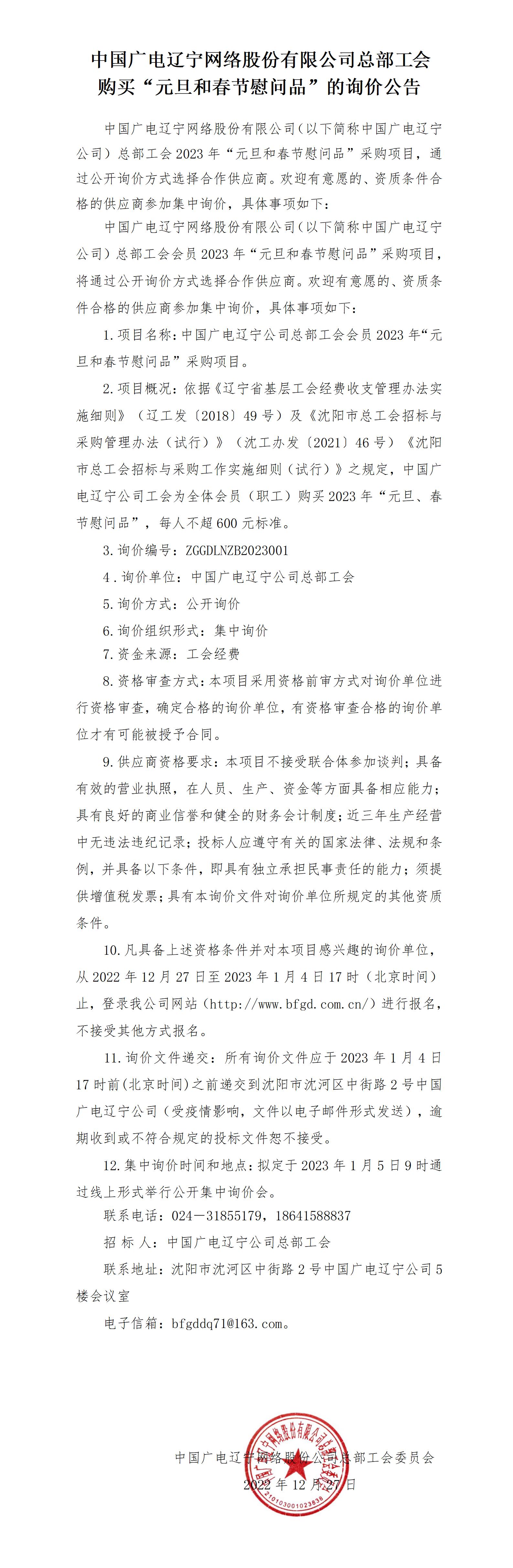 中國廣電遼寧網絡股份有限公司總部工會購買“元旦和春節慰問品”的詢價公告