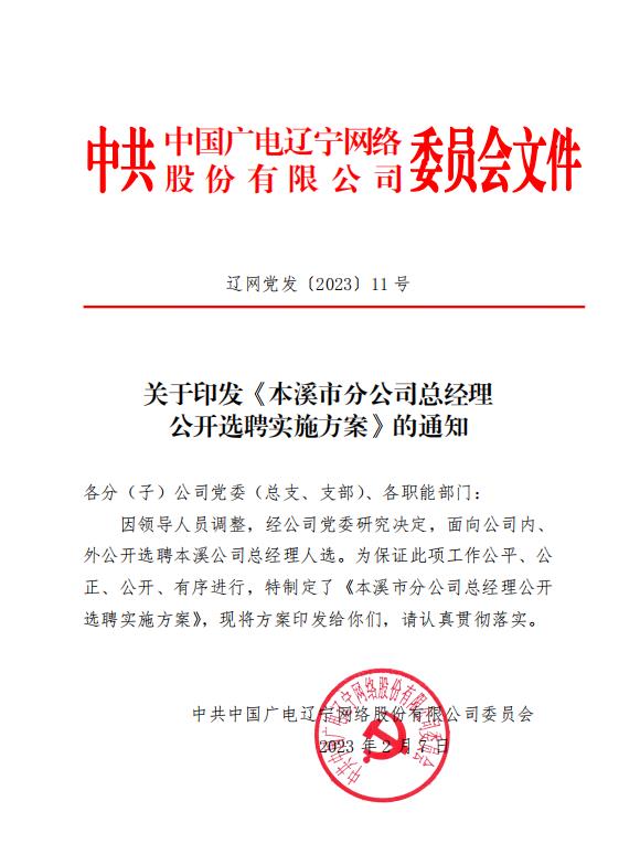 關于印發《本溪市分公司總經理 公開選聘實施方案》的通知