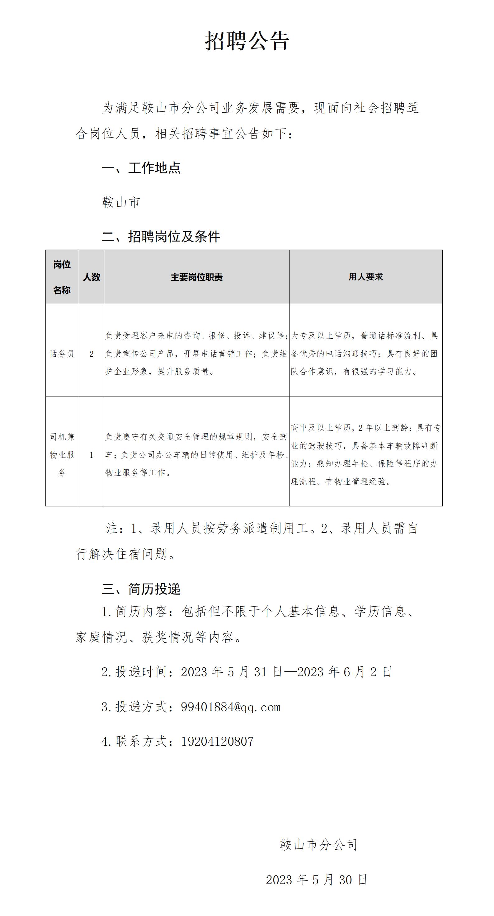 聯系人: 鞍山市分公司 簡歷投遞郵箱:99401884@qq.com