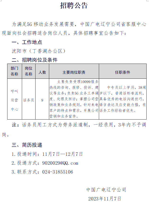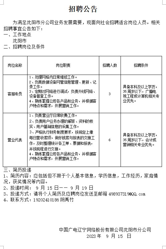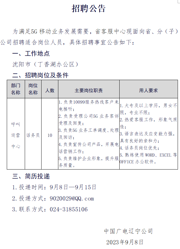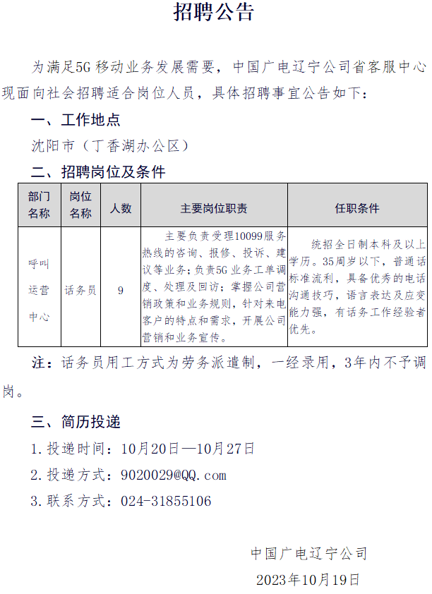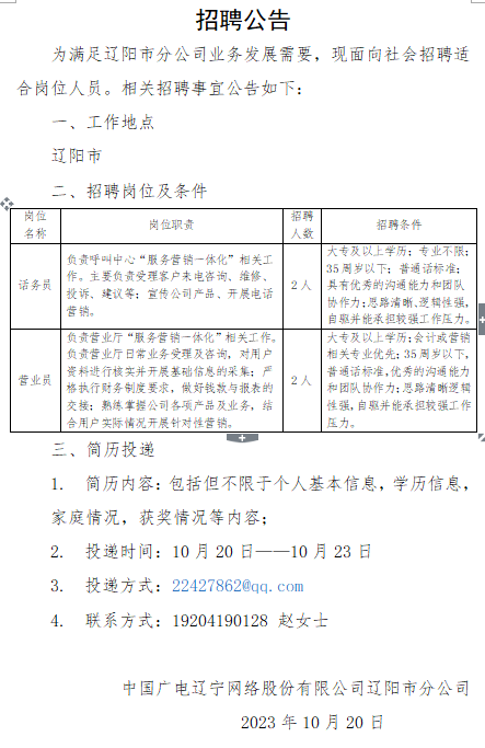 中國廣電遼寧公司遼陽市分公司對外招聘