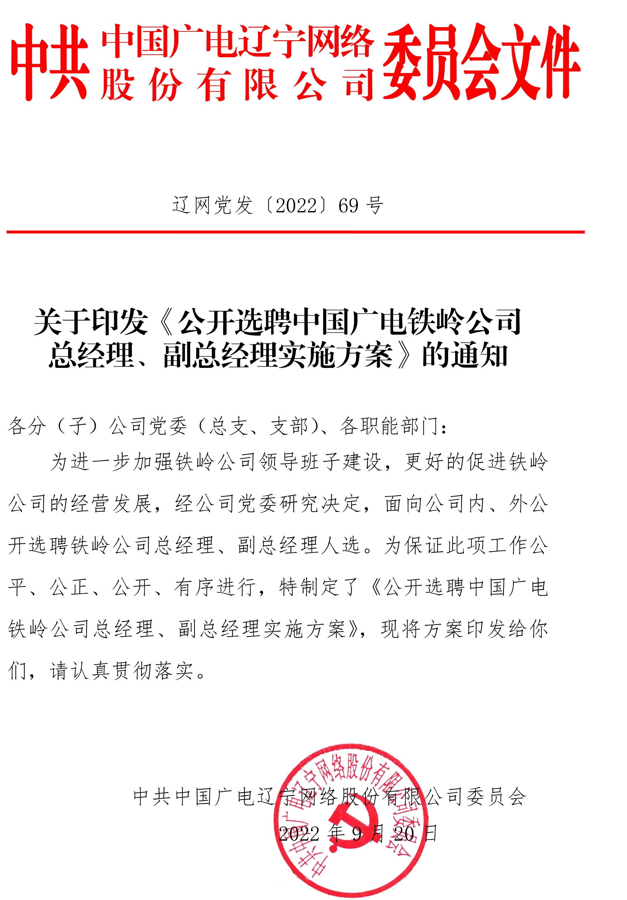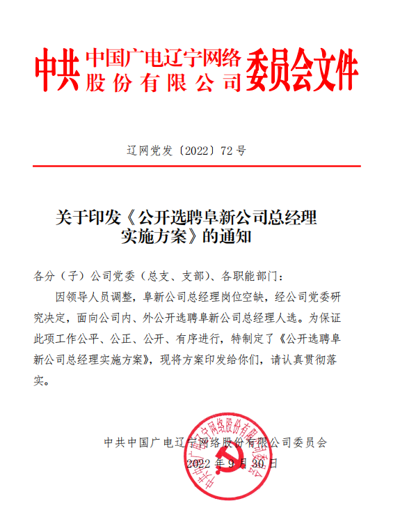 依據《公司中層領導人員管理暫行規定》(遼網黨發〔2021〕3 號(hao))的相(xiang)關規定,經(jing)公(gong)司黨委研究決(jue)定,面向公(gong)司內、外公(gong)開(kai)選聘阜(fu)新公(gong)司總經(jing)理(li)人選。具體方案如下(xia):