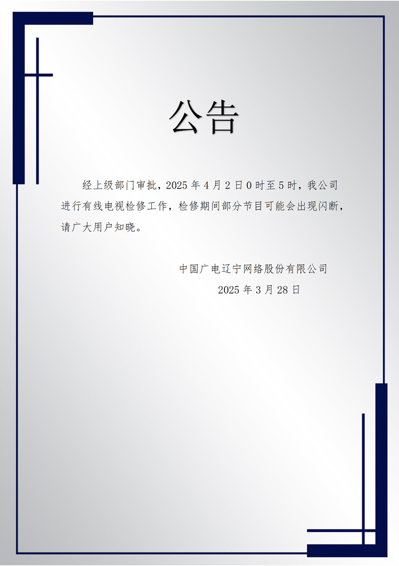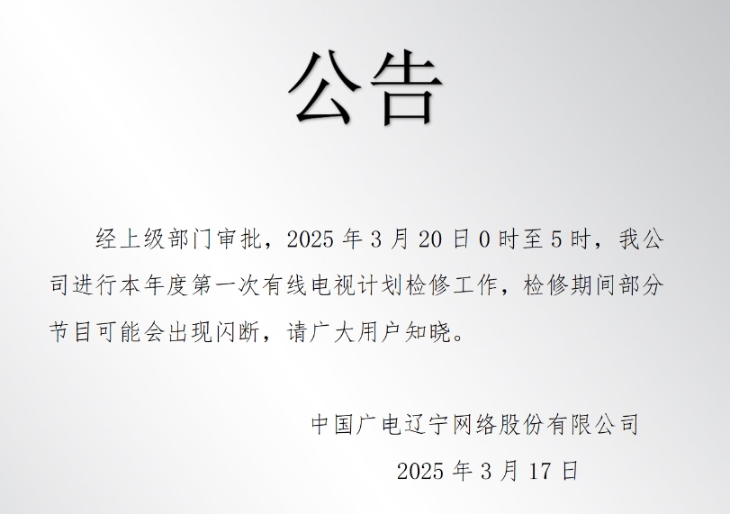 經上級部門審批,2025年3月20日0時至5時,我公司進行本年度第一次有線電視計劃檢修工作,檢修期間部分節目可能會出現閃斷,請廣大用戶知曉。