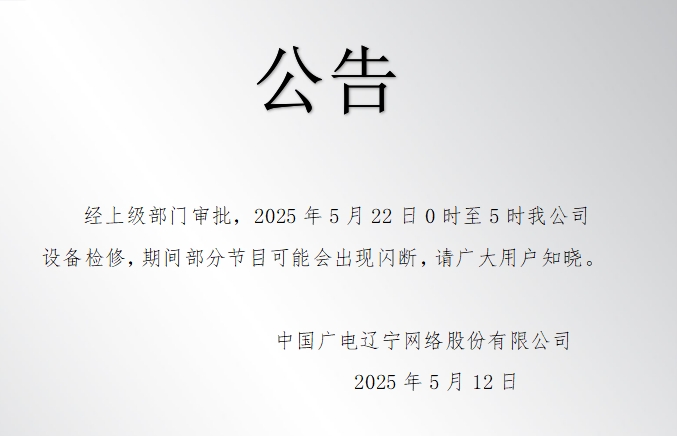 經上級部門審批,2025年5月22日0時至5時我公司設備檢修,期間部分節目可能會出現閃斷,請廣大用戶知曉。