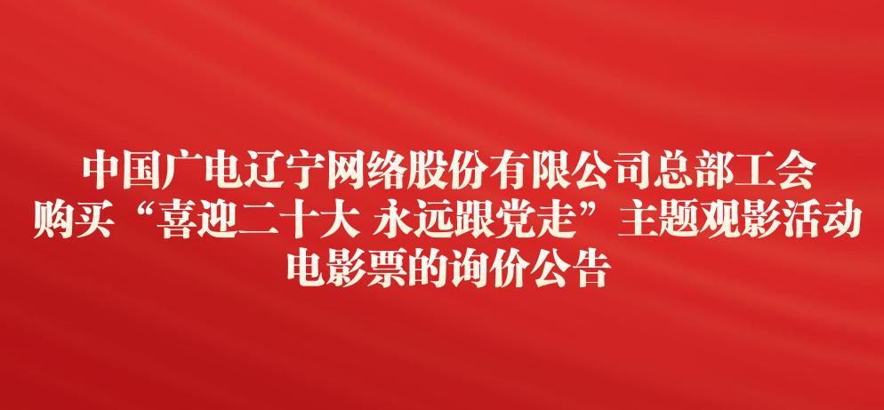 中國廣電遼寧網絡股份有限公司(以下簡稱中國廣電遼寧公司)總部工會“喜迎二十大 永遠跟黨走”主題觀影活動電影票采購項目,通過公開詢價方式選擇合作供應商。歡迎有意愿的、資質條件合格的供應商參加集中詢價,具體事項如下