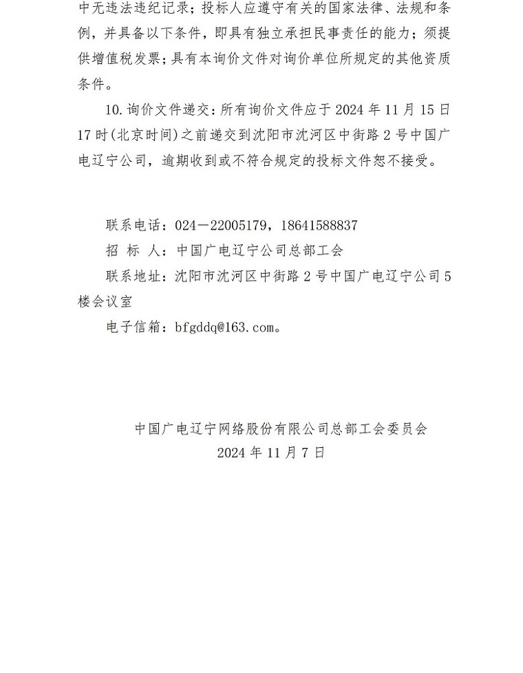中國廣電遼寧網絡股份有限公司總部工會購買“中秋、國慶節慰問品”的詢價公告