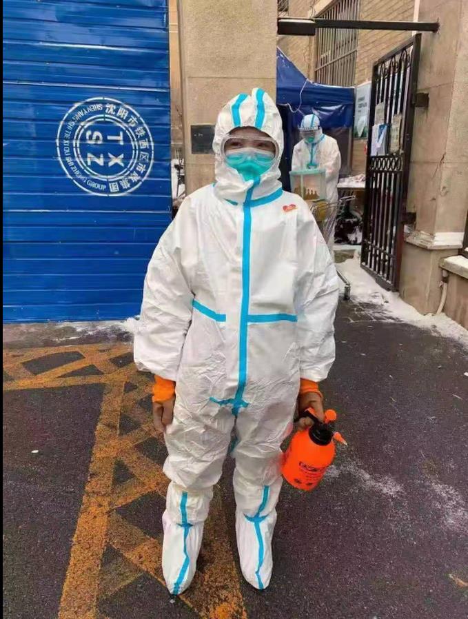 王捷是沈陽分公司鐵西區域一公司的營業代表。1月6日晚,沈陽市鐵西區發布《關于開展封閉園區志愿服務》的倡議書,家住篤工街道的王捷得知自己所在街道有中風險封閉小區、抗疫工作者人手緊缺后,第一時間與社區取得聯系,表達了做志愿者的想法,經與社區主任張寶蘭溝通后,王捷被編入社區抗疫消殺組,負責鐵西封閉園區納帕陽光小區的消殺工作。