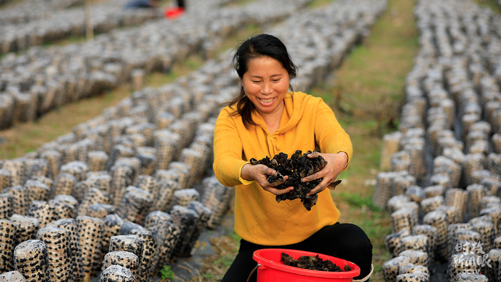 2月,貴州從江縣貫洞村木耳扶貧基地,村民展示剛采摘的木耳。