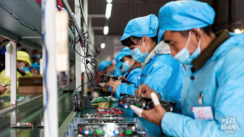 3月,安徽肥東縣古城鎮就業扶貧車間內,工人正在焊接電路板。