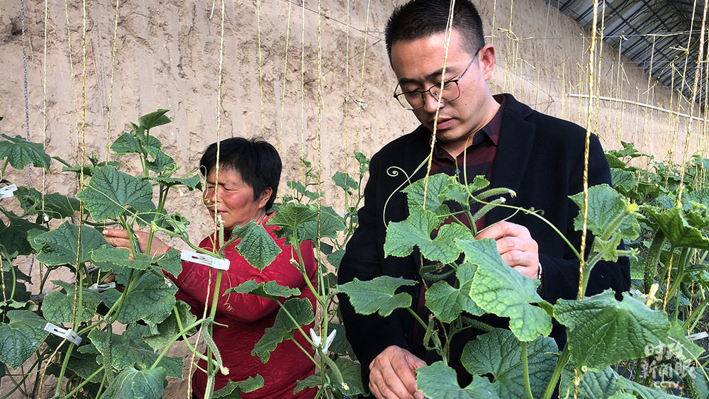 崔院強(右)從2017年7月起擔任陜西延安魏家溝村駐村第一書記,上個月剛剛獲得“全國脫貧攻堅先進個人”稱號。他帶領村民學習土壤治理、滴灌等技術,不斷提升大棚蔬菜品質。