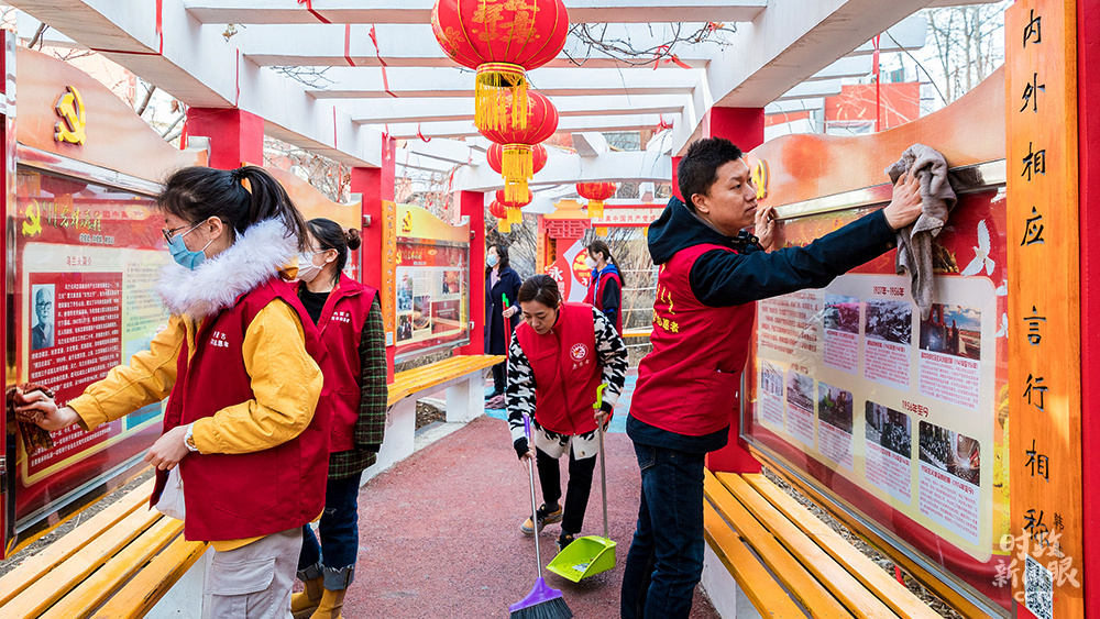3月4日,內蒙古呼和浩特市玉泉區的黨員干部、青年志愿者在清泉街社區黨建文化長廊內打掃衛生。