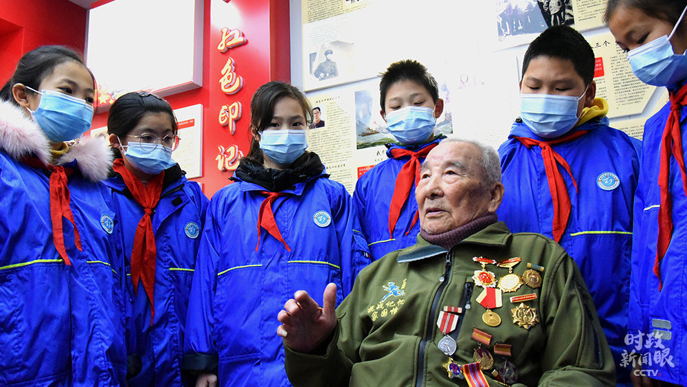 1月23日,江蘇省軍區連云港離職干部休養所,小學生聆聽93歲老軍人孟昭宇講述親身經歷的戰斗故事。