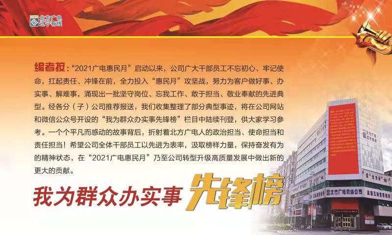 城建南郡業主趙先生,有線電視和寬帶即將到期,楊婷婷在打電話提醒趙先生繳費時了解到,趙先生和愛人每天一早就出門直到晚上9點才能回家,兩人根本沒有時間到營業廳辦理續費。為了不影響他的孩子線上學習,征求趙先生同意后,楊婷婷在電視到期前一天自己先墊付為趙先生續費,第二天又起大早趕在趙先生上班前把發票送到趙先生家中。看到楊婷婷全心全意為用戶著想,趙先生說:“就沖著這么勤勞周到的營業員,我也會一直使用北方廣電的寬帶!”